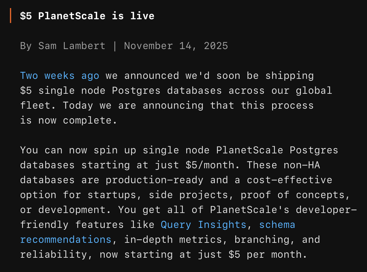Planetscale recently announced their new $5 Postgres instance (PS-5) and I wanted to give it a test.